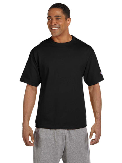 Meet the Champion Heritage t shirt. It is made with 100% Cotton Extra-Heavyweight 7oz cotton. If you want a heavy-duty t-shirt, this is the one you want.A full athletic cut makes it fit a little larger than most tees, so bear in mind that it will fit big when you order it. This makes it a great regular-sized shirt for tall men to order since it's designed to fit loosely.
