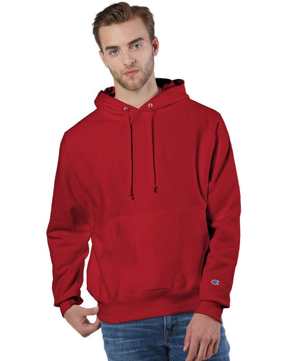 Description: Champion Reverse Weave Hooded Sweatshirt. Extra-heavyweight 12oz low shrink fabric. 82% cotton, 18% polyester (Silver Grey is 81% cotton, 17% polyester, 2% Black Rayon). Drawcord hood with metal grommets, muff pocket, full athletic cut, side gussets, 3 3/4" ribbed cuffs and waistband. Champion "C" logo above left cuff. Colors: Black, Dark Green, Oxford Grey, Scarlet, Silver Grey, Sport Dark Navy, Sport Maroon and Sport Royal. Sizes: S-3XL
