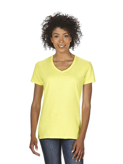Gildan Ladies Heavy Cotton V-Neck Tee. Made from 5.3 oz., 100% cotton. (Sport Grey is 90% cotton and 10% polyester. Graphite Heather, Heather Navy and Heather Radiant Orchid are 50% cotton and 50% polyester. Collar is a "mitered V-neck. Has a missy contoured silhouette with sideseam, cap sleeve, satin label, taped neck and shoulders. Sizes: S-3XL